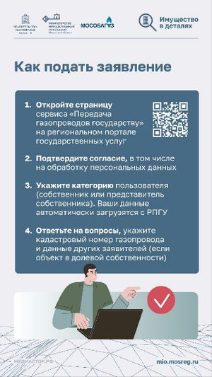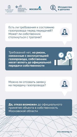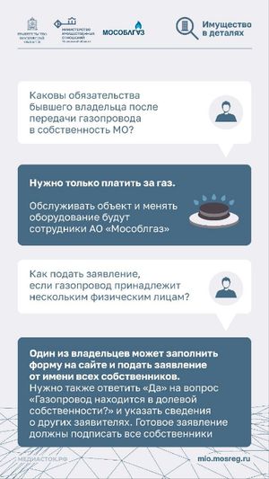 В Подмосковье есть возможность передать свое газовое хозяйство в руки государства. Сделать это можно с помощью нового онлайн сервиса. В наших инфокарточках отвечаем на часто задаваемые вопросы жителей.