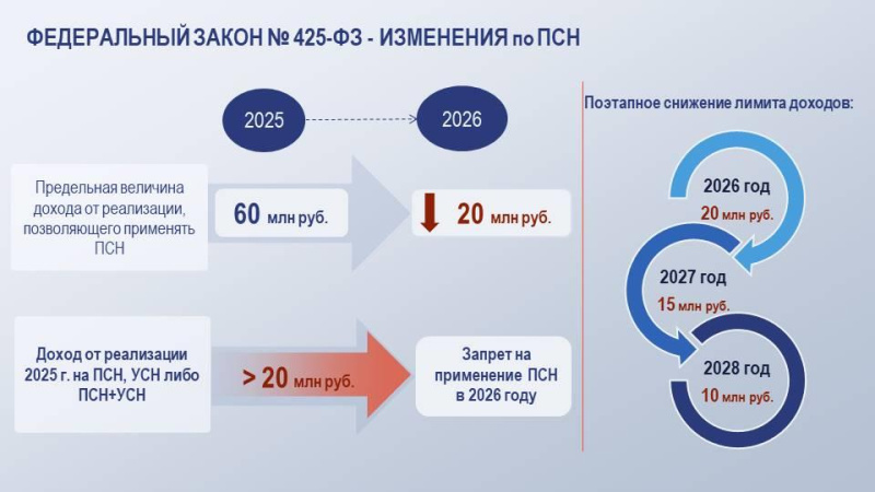 С 01.01.2026 в части патентной системы налогообложения (ПСН) вступают в силу изменения, внесенные Федеральным законом от 28.11.2025 № 425-ФЗ в главу 26.5 Налогового кодекса Российской Федерации (далее – НК РФ), - предусмотрено поэтапное снижение лимита предельных доходов на ПСН.