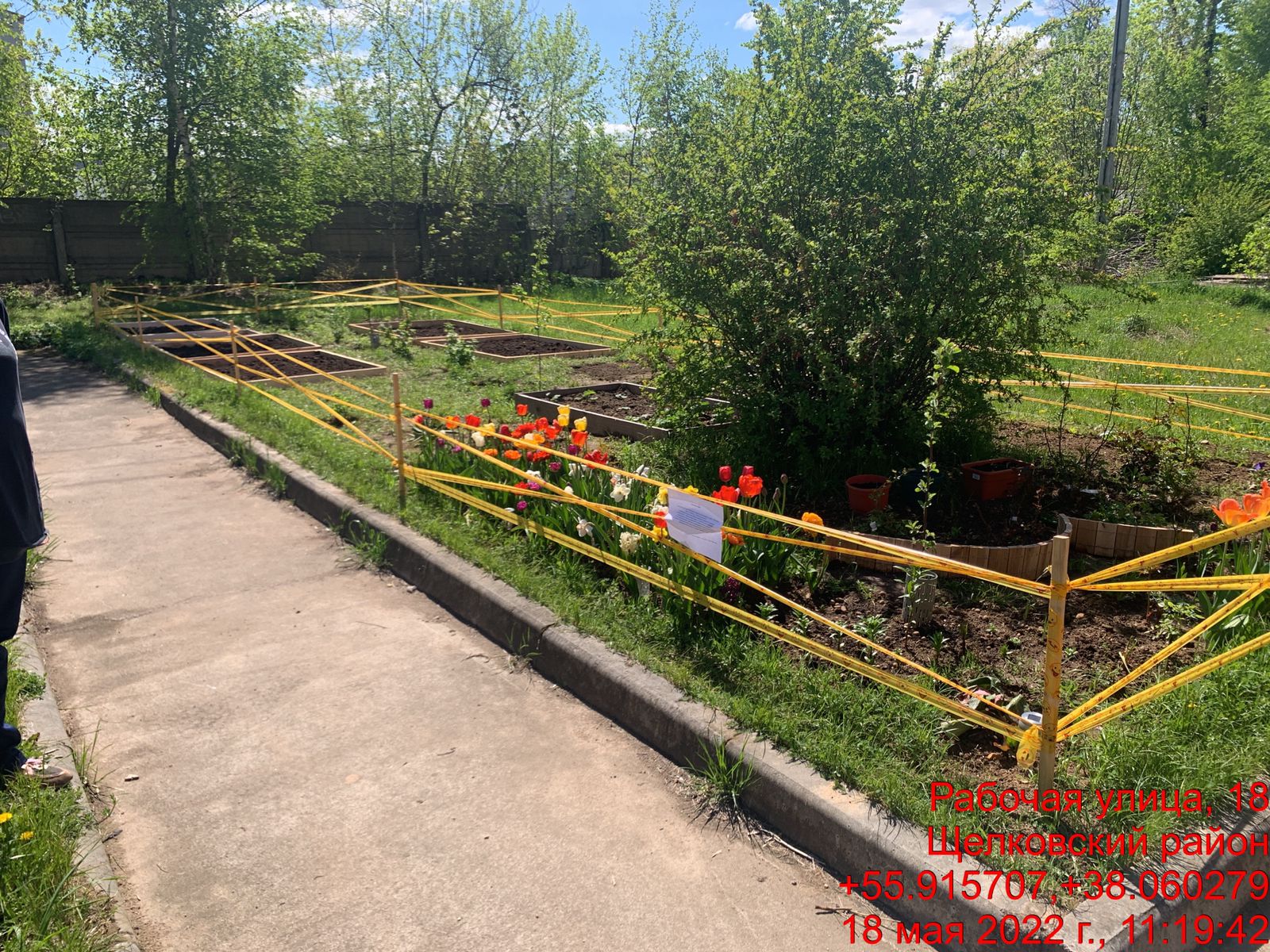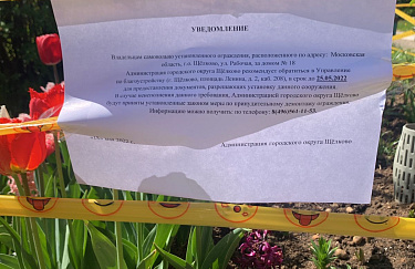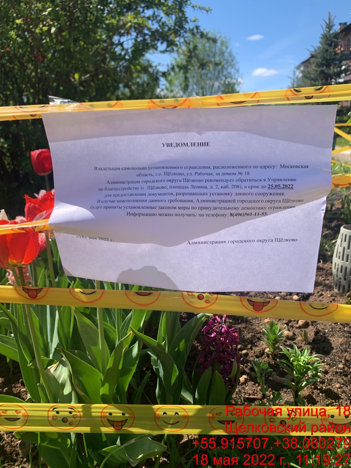 Владельцам самовольно установленного ограждения на прилегающей территории к многоквартирному дому по адресу: Московская область, городской округ Щёлково, г. Щёлково, ул. Рабочая, за домом № 18 (координаты 55.915755, 38.060100); необходимо в 7-дневный срок со дня опубликования настоящего объявления, необходимо обратиться в Управление по благоустройству Администрации городского округа Щёлково (г. Щёлково, площадь Ленина, д. 2, каб. 208), в срок до 25.05.2022 для предоставления документов, разрешающих установку данного объекта.