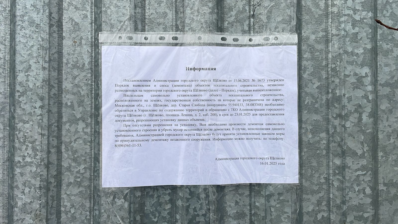 Постановлением Администрации городского округа Щёлково от 15.06.2021 № 1673 утвержден Порядок выявления и сноса (демонтажа) объектов некапитального строительства, незаконно размещенных на территории городского округа Щёлково (далее – Порядок), учитывая вышеизложенное: Владельцам самовольно установленного объекта некапитального строительства, расположенного на землях, государственная собственность на которые не разграничена по адресу: Московская обл., г.о. Щёлково, дер. Старая Слобода (координаты 55.940133, 38.083348) необходимо обратиться в Управление по содержанию территорий и обращению с ТКО Администрации городского округа Щёлково (г. Щёлково, площадь Ленина, д. 2, каб. 208) в срок до 23.01.2025 для предоставления документов, разрешающих установку данных объектов. При отсутствии разрешения на установку Вам необходимо произвести демонтаж самовольно установленных строений и убрать мусор, оставшейся после демонтажа. В случае неисполнения данного требования Администрацией городского округа Щёлково будут приняты установленные законом меры по принудительному демонтажу незаконного сооружения. Информацию можно получить по телефону: 8(496)561–11–53.