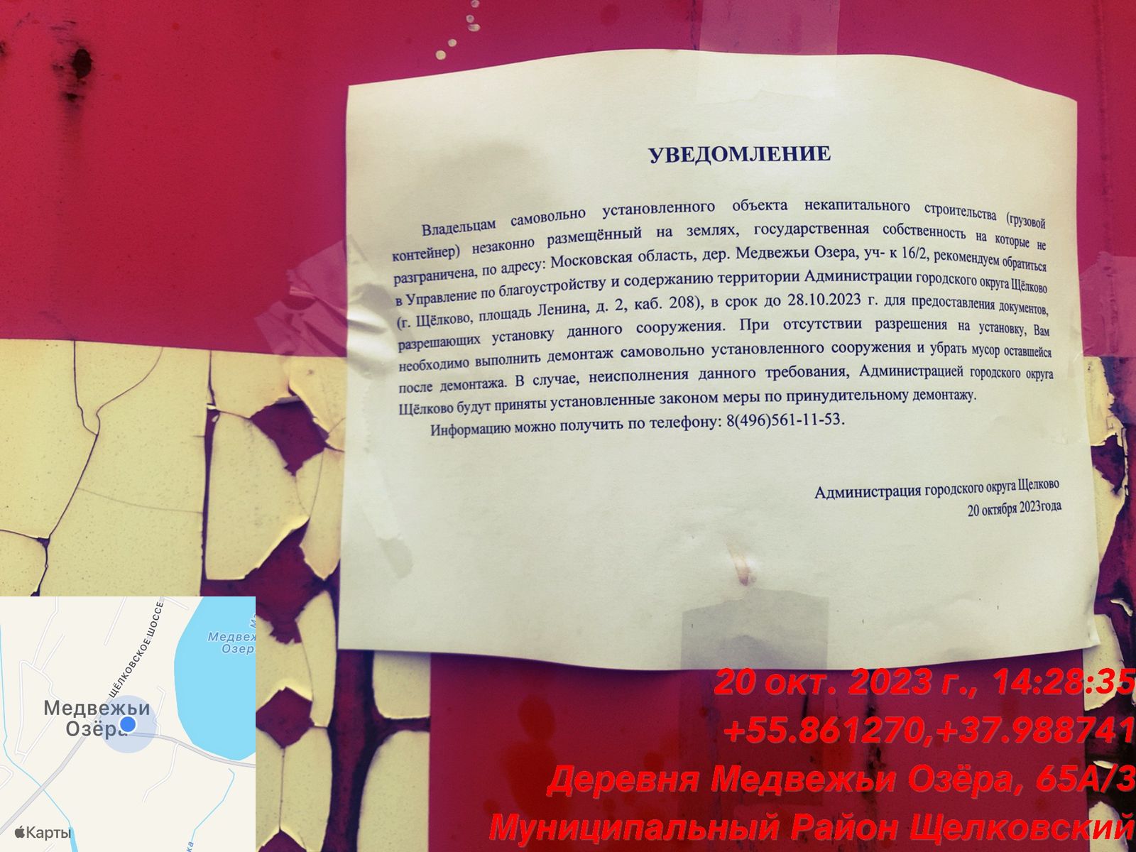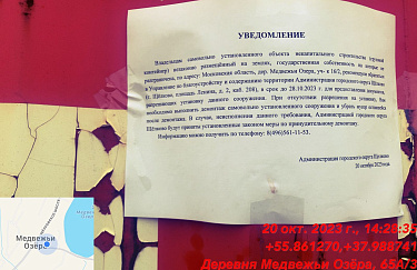 В соответствии с Порядком выявления и сноса (демонтажа) объектов некапитального строительства, незаконно размещённых на территории городского округа Щёлково, утверждённым постановлением Администрации городского округа Щёлково от 15.06.2021 г. № 1673. Владельцам самовольно установленного объекта некапитального строительства (грузовой контейнер) незаконно размещённый на землях, государственная собственность на которые не разграничена, по адресу: Московская область, дер. Медвежьи Озера, уч- к 16/2 (координаты 55.861270; 37.988741) рекомендуем обратиться в Управление по благоустройству и содержанию территории Администрации городского округа Щёлково (г. Щёлково, площадь Ленина, д. 2, каб. 208), в срок до 27.10.2023 г. для предоставления документов, разрешающих установку данного сооружения.