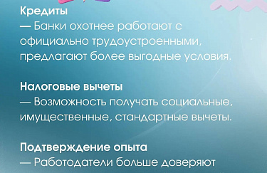 - • Банки охотнее работают с официально трудоустроенными гражданами и предлагают более выгодные условия