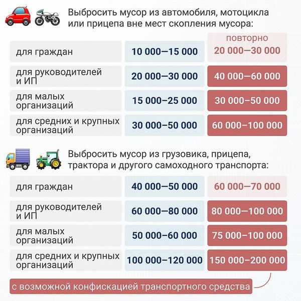 Штрафы внушительные и различаются в зависимости от статуса нарушителя и вида транспорта. Смотрите памятку с этими космическими цифрами и соблюдайте чистоту.