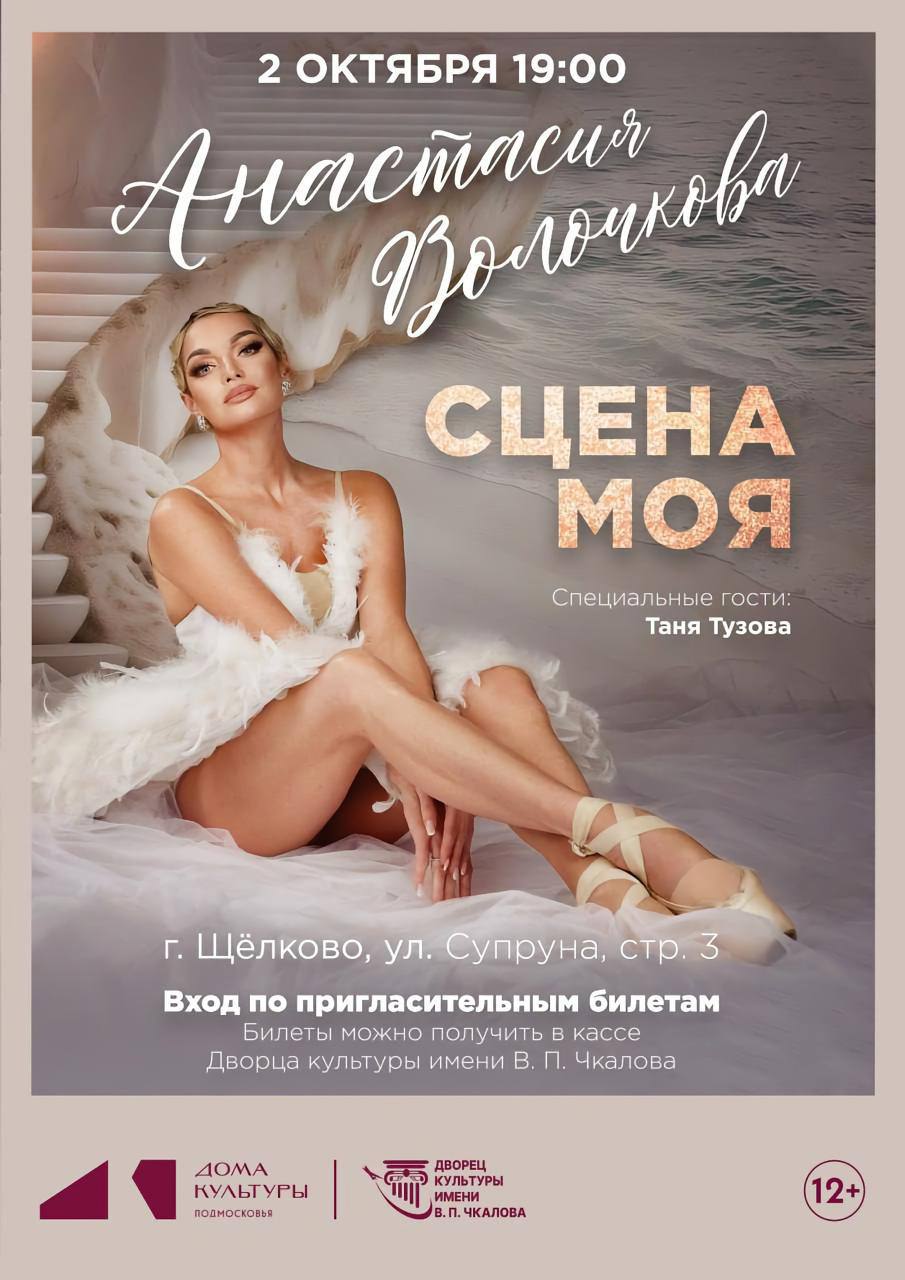 Российская балерина Анастасия Волочкова выступит во Дворце культуры имени В.П. Чкалова в Щёлкове.Заслуженная артистка России уже радовала жителей нашего округа своим благотворительным шоу «Одержимость». В этот четверг Анастасия вновь выйдет на сцену — на этот раз во Дворце культуры имени В. П. Чкалова!